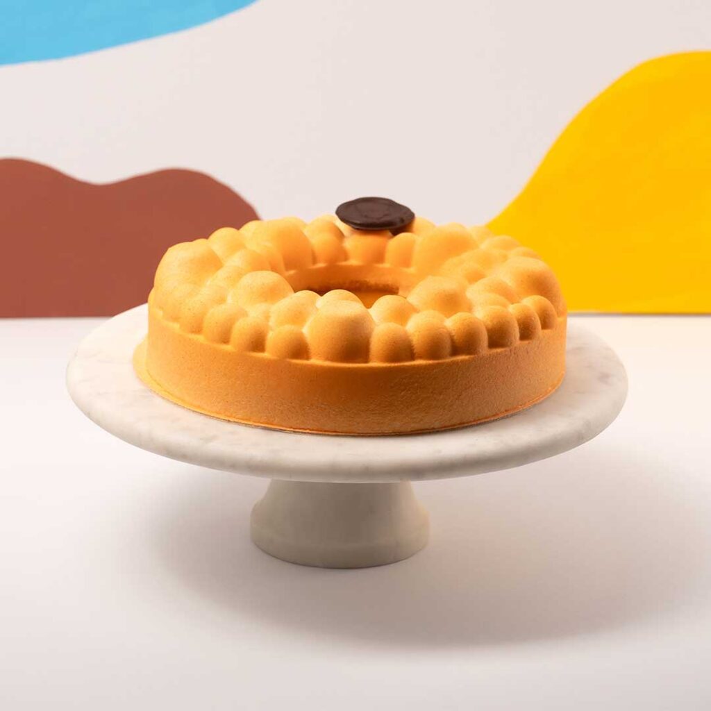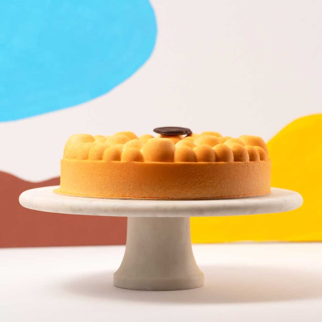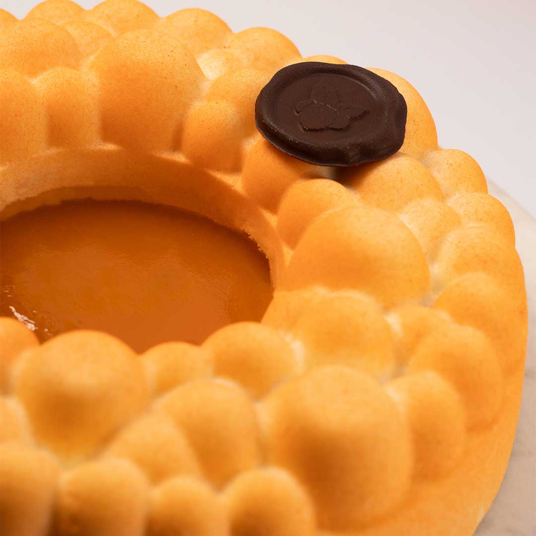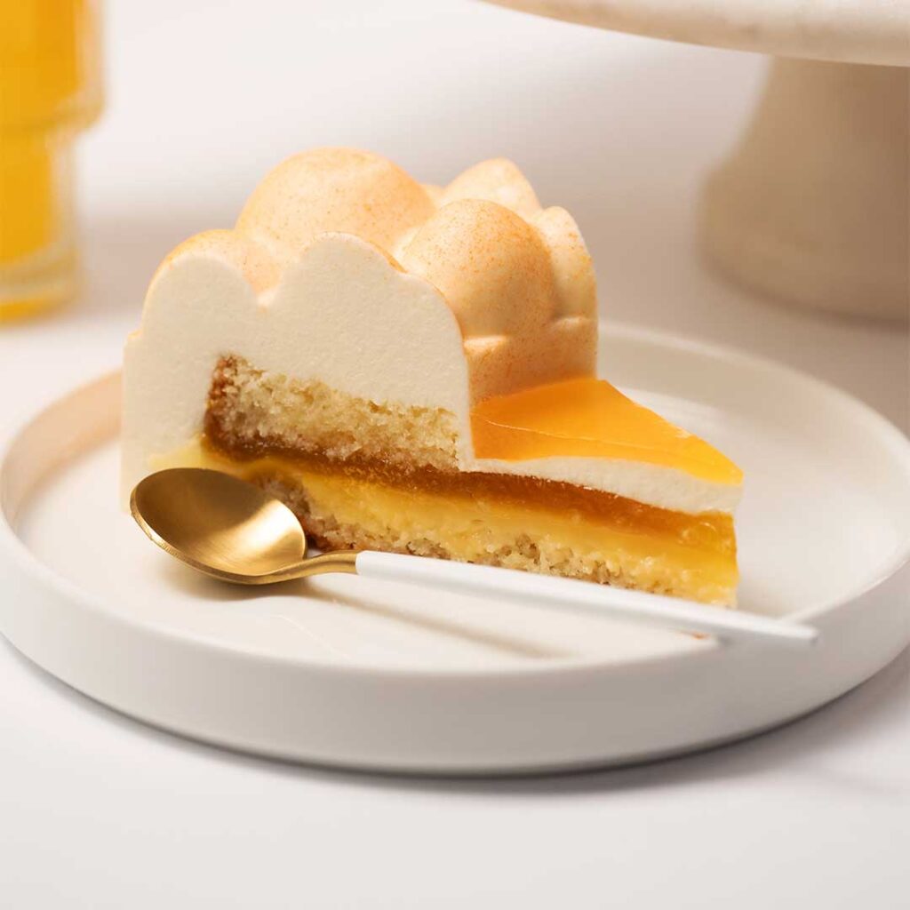 Un delicioso entremet de mousse de chocolate blanco, aromatizado con vino blanco, relleno con capas de pan de vainilla humectado con jarabe para carajillo y un toque de naranja, una capa de cremoso de mandarina, una capa de gel de mandarina y maracuyá.